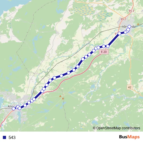 The first stop of the 543 bus route is Alingsås station and the last stop is Vårgårda station. 543 is operational during everyday.