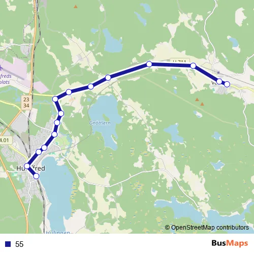 The first stop of the 55 bus route is Vena södra and the last stop is Hultsfred station. 55 is operational during on weekdays.