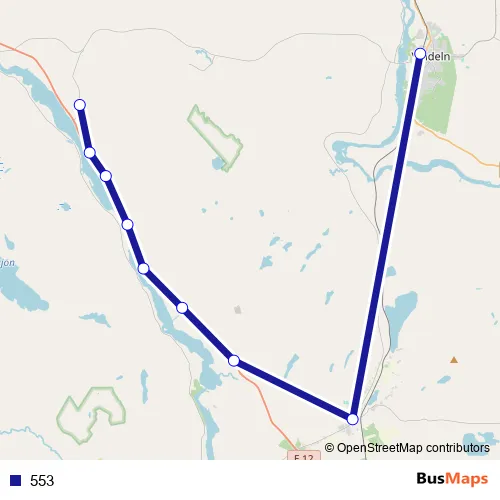 The first stop of the 553 bus route is Nyland and the last stop is Vindeln Resecentrum/Station. 553 is operational during everyday.