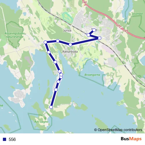 The first stop of the 556 bus route is Ådö (Bro) and the last stop is Bro centrum. 556 is operational during everyday.