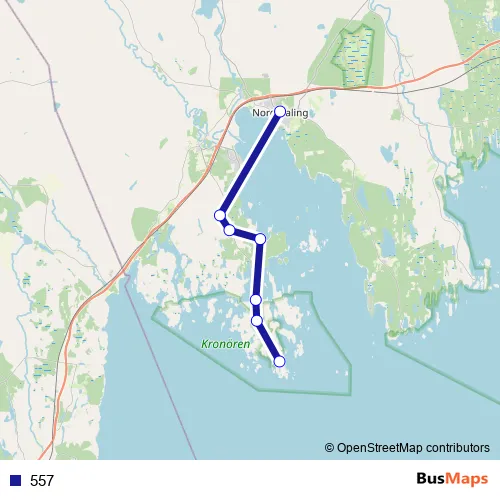 The first stop of the 557 bus route is Nordmaling Torget and the last stop is Långron. 557 is operational during everyday.