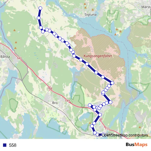 The first stop of the 558 bus route is Kungsängen station and the last stop is Håtuna kyrka. 558 is operational during everyday.