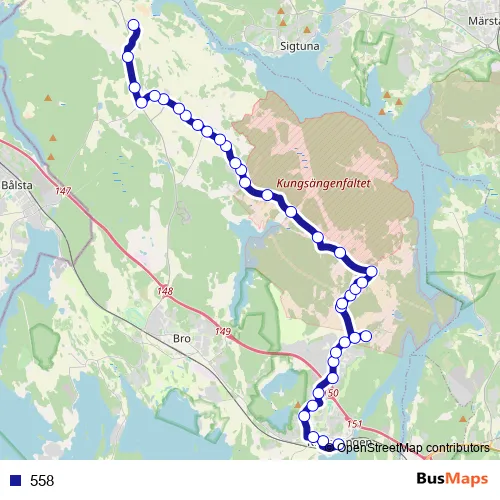 The first stop of the 558 bus route is Kungsängens station and the last stop is Håtuna kyrka. 558 is operational during everyday.