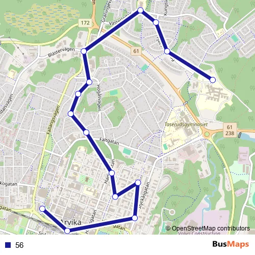 The first stop of the 56 bus route is Arvika busstation and the last stop is Arvika sjukhus huvudentrén. 56 is operational during everyday.