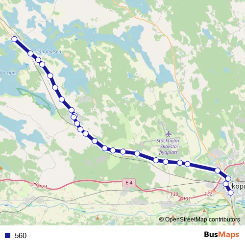The first stop of the 560 bus route is Vrena and the last stop is Nyköping busstation. 560 is operational during on weekdays.