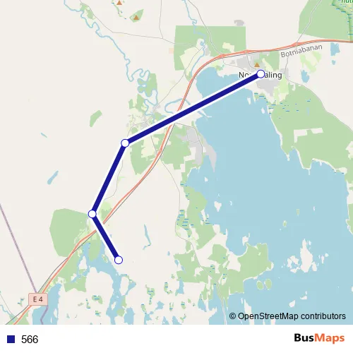 The first stop of the 566 bus route is Tännstrand and the last stop is Nordmaling Torget. 566 is operational during everyday.