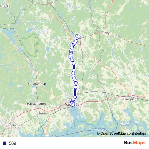 The first stop of the 569 bus route is Västerås Centralstation and the last stop is Sala station. 569 is operational during everyday.