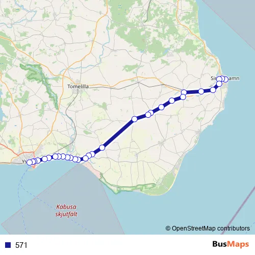 The first stop of the 571 bus route is Simrishamn station and the last stop is Ystad station. 571 is operational during everyday.