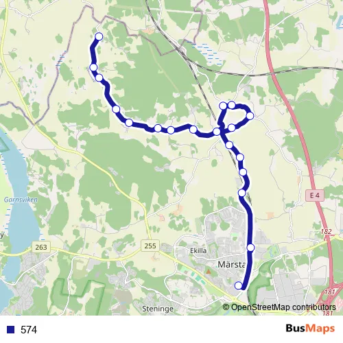 The first stop of the 574 bus route is Märsta centrum and the last stop is Hova. 574 is operational during everyday.