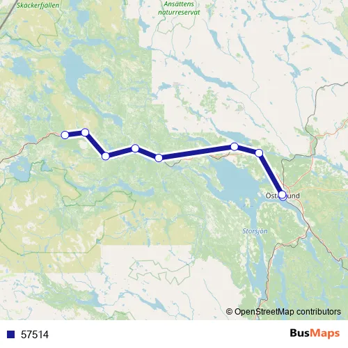 The first stop of the 57514 bus route is Östersund Centralstation and the last stop is