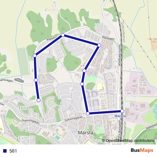 The first stop of the 581 bus route is Märsta station and the last stop is Fasanvägen. 581 is operational during everyday.