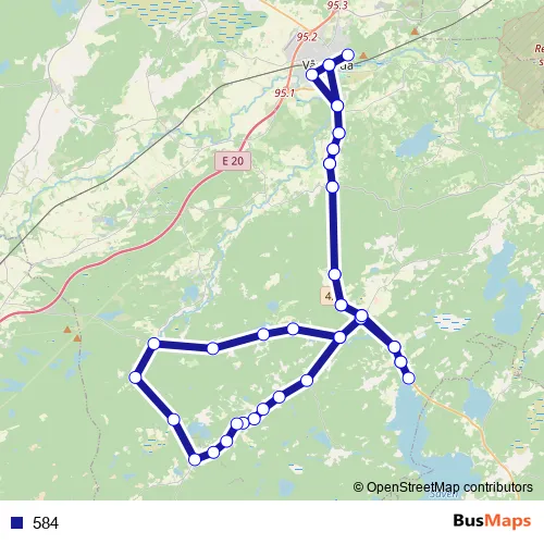 The first stop of the 584 bus route is Lindbladskolan and the last stop is Vårgårda station. 584 is operational during on weekdays.