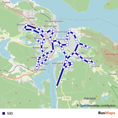 The first stop of the 590 bus route is Härnösand centrum and the last stop is Härnösand centrum. 590 is operational during on weekdays.