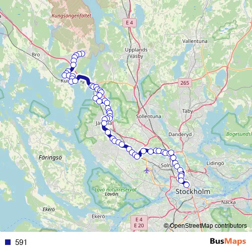 The first stop of the 591 bus route is Livgardet and the last stop is Kungsängens station. 591 is operational during everyday.