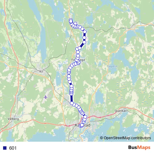 The first stop of the 601 bus route is Karlstad busstation and the last stop is Tjärnheden bytespunkt, Deje. 601 is operational during everyday.
