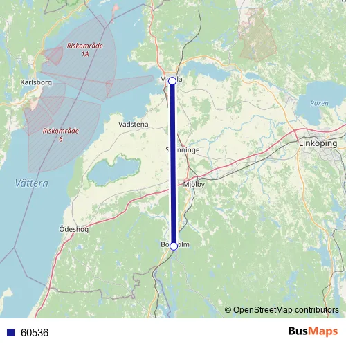 The first stop of the 60536 bus route is Älmhult station and the last stop is