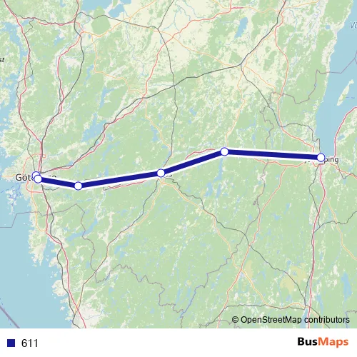 The first stop of the 611 bus route is Göteborg Nils Ericsonterminal and the last stop is Jönköping Centralstation. 611 is operational during everyday.