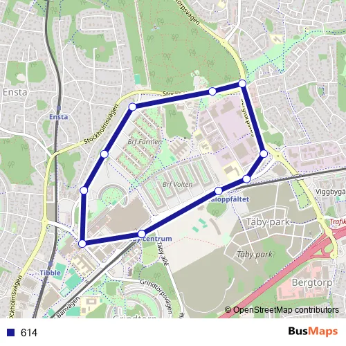 The first stop of the 614 bus route is Täby centrum station and the last stop is Täby centrum station. 614 is operational during everyday.