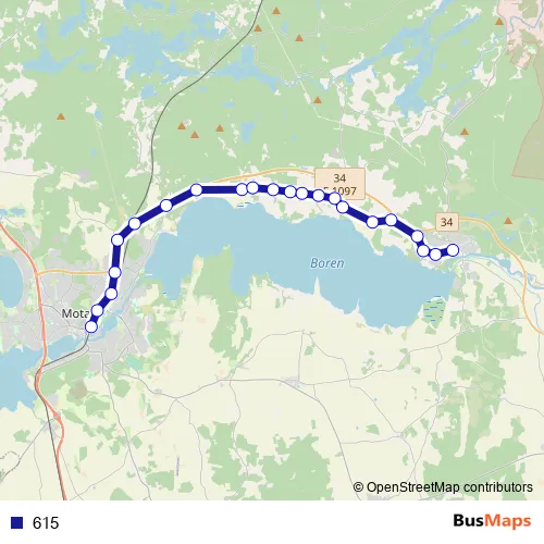 The first stop of the 615 bus route is Motala station and the last stop is Borensbergs bussterminal. 615 is operational during everyday.