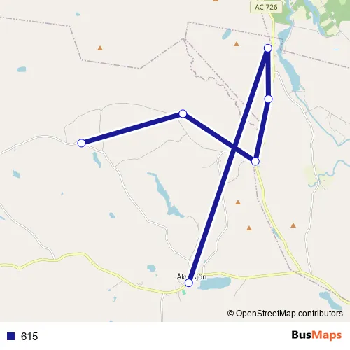 The first stop of the 615 bus route is Åkullsjön and the last stop is Gulltjärn. 615 is operational during everyday.