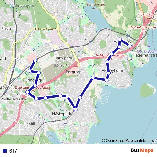 The first stop of the 617 bus route is Pilotvägen and the last stop is Täby centrum station. 617 is operational during everyday.