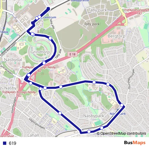The first stop of the 619 bus route is Täby centrum and the last stop is Täby centrum. 619 is operational during on weekdays.