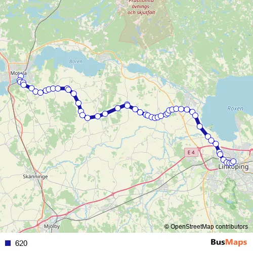 The first stop of the 620 bus route is Motala station and the last stop is Linköping Centralstation. 620 is operational during everyday.