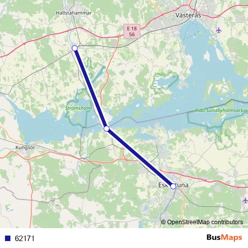 The first stop of the 62171 bus route is Kolbäck station and the last stop is Eskilstuna Centralstation. 62171 is operational during everyday.