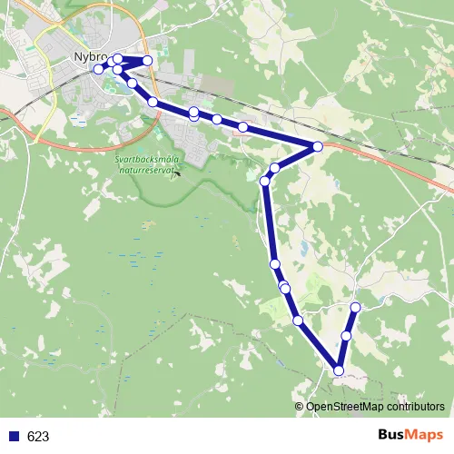 The first stop of the 623 bus route is Nybro station and the last stop is Sankt Sigfrid kyrka. 623 is operational during on weekdays.