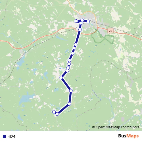 The first stop of the 624 bus route is Alsjöholm skola and the last stop is Nybro station. 624 is operational during on weekdays.