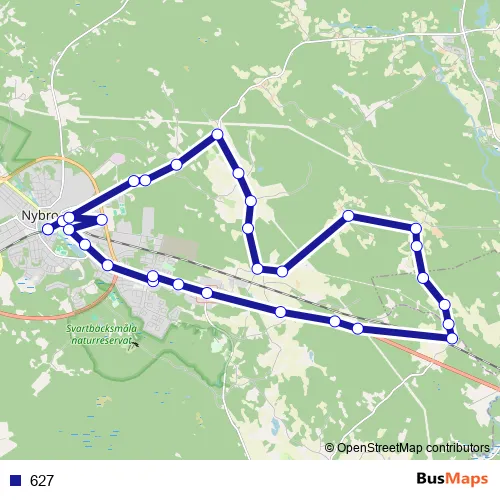 The first stop of the 627 bus route is Nybro station and the last stop is Nybro station. 627 is operational during on weekdays.