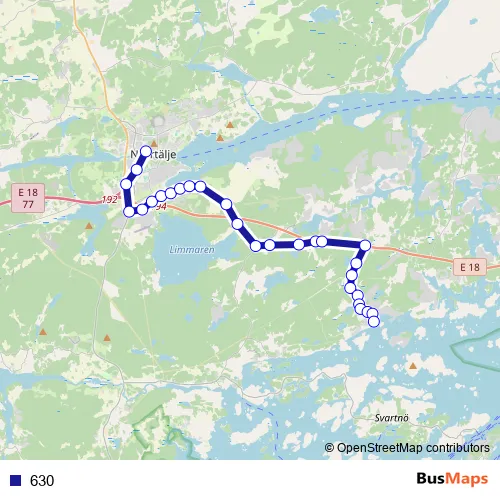 The first stop of the 630 bus route is Norrtälje busstation and the last stop is Spillersboda brygga. 630 is operational during everyday.