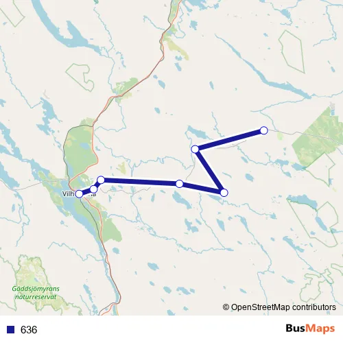 The first stop of the 636 bus route is Risträsk and the last stop is Vilhelmina station. 636 is operational during everyday.