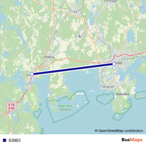 The first stop of the 63963 bus route is Karlstad Centralstation and the last stop is Grums station. 63963 is operational during on weekends.