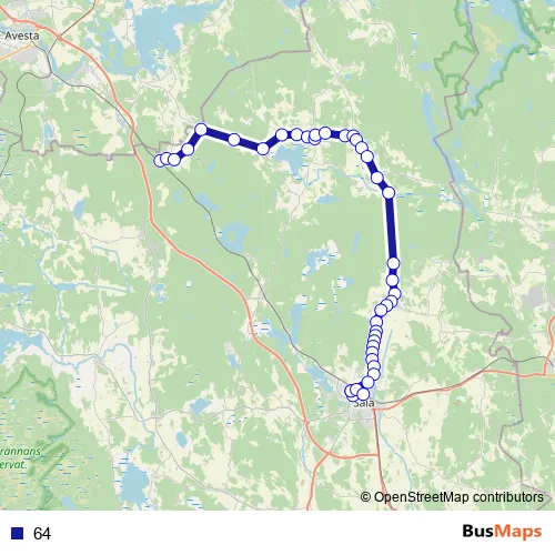 The first stop of the 64 bus route is Rosshyttan and the last stop is Sala station. 64 is operational during on weekdays.