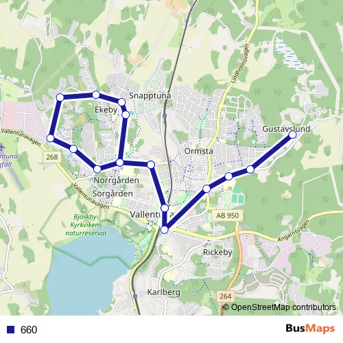 The first stop of the 660 bus route is Gustavslund and the last stop is Vallentuna station västra. 660 is operational during everyday.