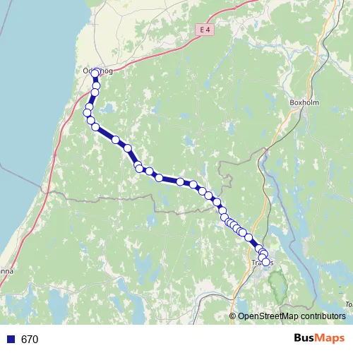 The first stop of the 670 bus route is Ödeshög torget and the last stop is Tranås Parkhallen. 670 is operational during on weekdays.