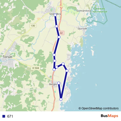 The first stop of the 671 bus route is Bergkvara skola, vändplan and the last stop is Söderåkra kyrka. 671 is operational during on weekdays.
