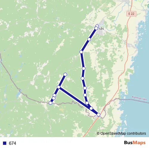 The first stop of the 674 bus route is Torskolan and the last stop is Gåsabo vsk. 674 is operational during on weekdays.