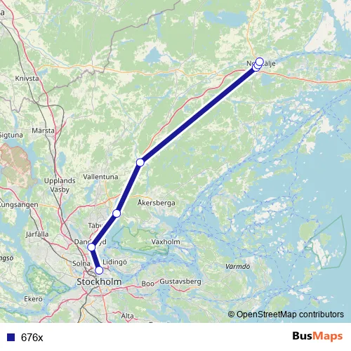 The first stop of the 676x bus route is Tekniska Högskolan T-bana and the last stop is Norrtälje busstation. 676x is operational during on weekdays.