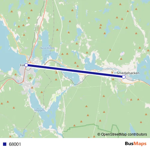 The first stop of the 68001 bus route is Ludvika station and the last stop is Smedjebacken station. 68001 is operational during everyday.