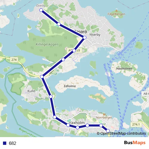 The first stop of the 682 bus route is Överby and the last stop is Vaxholm Västerhamnsplan. 682 is operational during everyday.