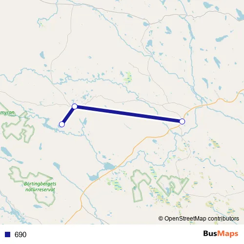 The first stop of the 690 bus route is Myrträsk and the last stop is Vägsele väg 365. 690 is operational during on weekdays.