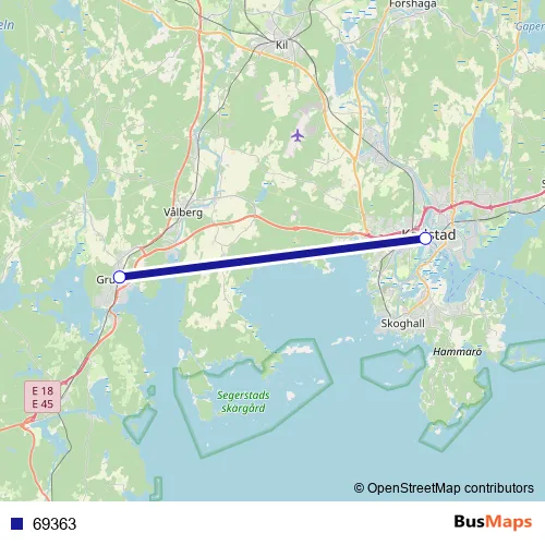 The first stop of the 69363 bus route is Karlstad Centralstation and the last stop is Grums station. 69363 is operational during everyday.