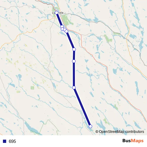 The first stop of the 695 bus route is Lycksele Resecentrum/Station and the last stop is Örträsk. 695 is operational during everyday.