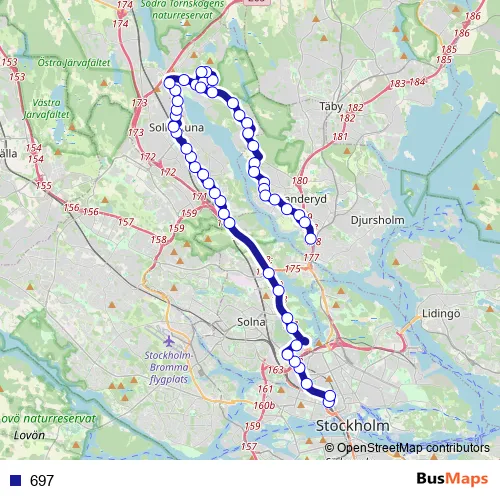 The first stop of the 697 bus route is Cityterminalen and the last stop is Danderyds sjukhus. 697 is operational during everyday.
