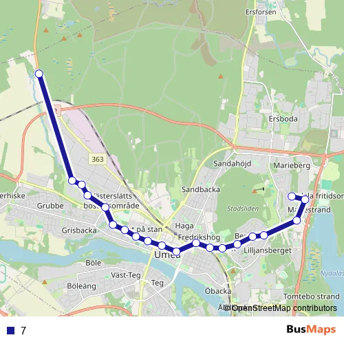 The first stop of the 7 bus route is Umeå Morkullevägen and the last stop is Umeå Rödberget. 7 is operational during everyday.