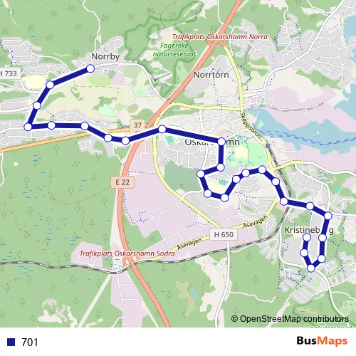 The first stop of the 701 bus route is Oskarshamn Kristineberg centrm and the last stop is Flathultsvägen. 701 is operational during everyday.