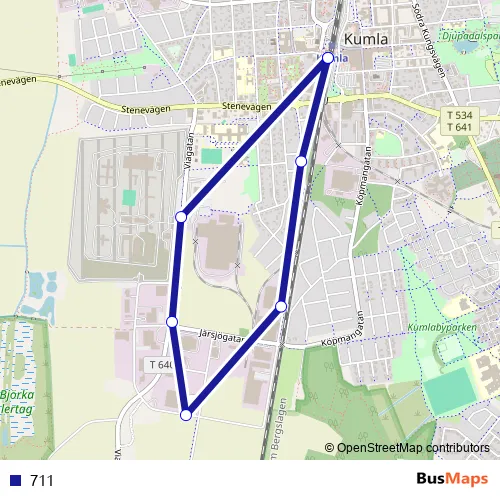 The first stop of the 711 bus route is Kumla station and the last stop is Kumla station. 711 is operational during on weekdays.