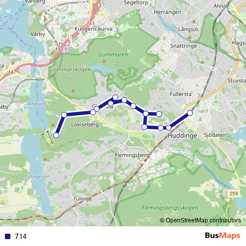 The first stop of the 714 bus route is Huddinge station and the last stop is Flottsbro. 714 is operational during everyday.